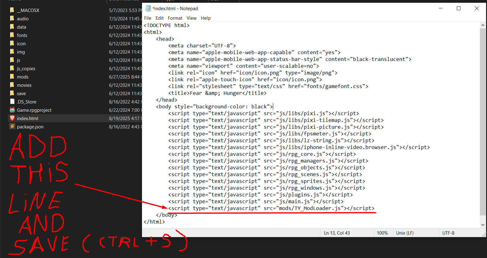 Ok, i made you a little visual tutorial. 1. open www folder. 2. create a folder named "mods". 3. open index.html via notepad. 4. add the line i mention at the bottom and save the file. <script type="text/javascript" src="mods/TY_ModLoader.js"></script> 5. add your mods to the "mods" folder you just created. 6. open the TY_ModLoader.js file in notepad 7. add the filenames of your mods inside the "TY.MOD_LIST" section shown in the screenshot.
